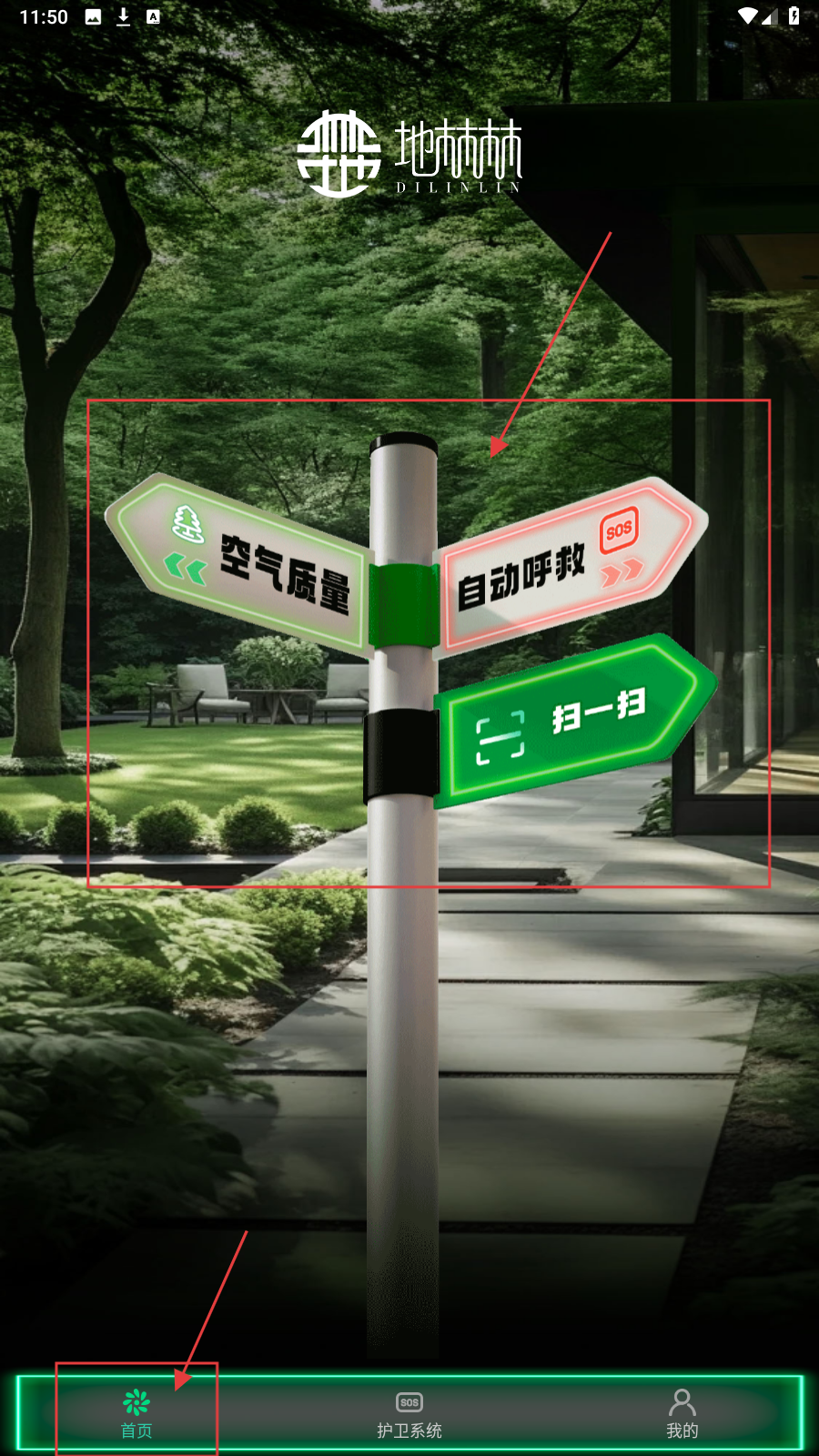 1、打开“地林林”应用,在【首页】可见“空气质量”“自动呼救”“扫一扫”功能指引标识,按需点击使用对应功能。