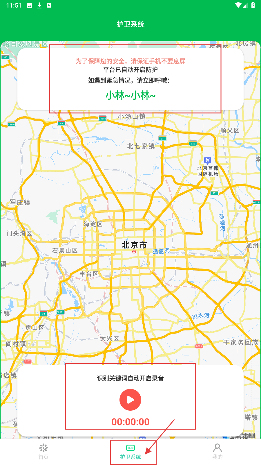 2、切换至【护卫系统】页,会有安全提示,地图展示位置,可识别关键词自动录音,遇危险辅助呼救。
