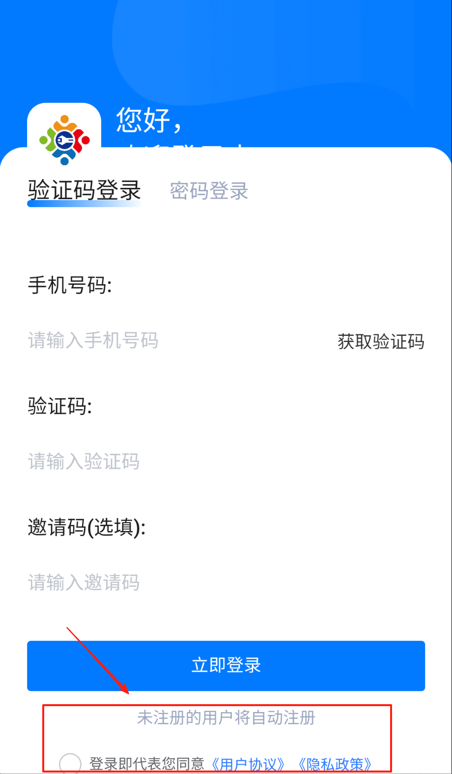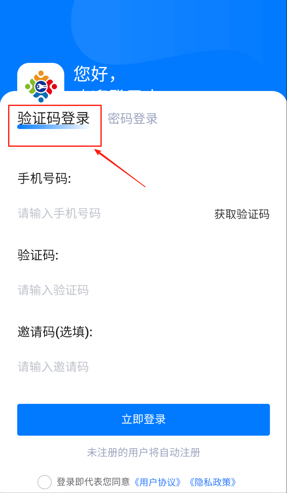 1、验证码登录先输手机号点获取验证码,收短信填进框内,有邀请码选填位置,最后点蓝色登录键就能进入平台啦。