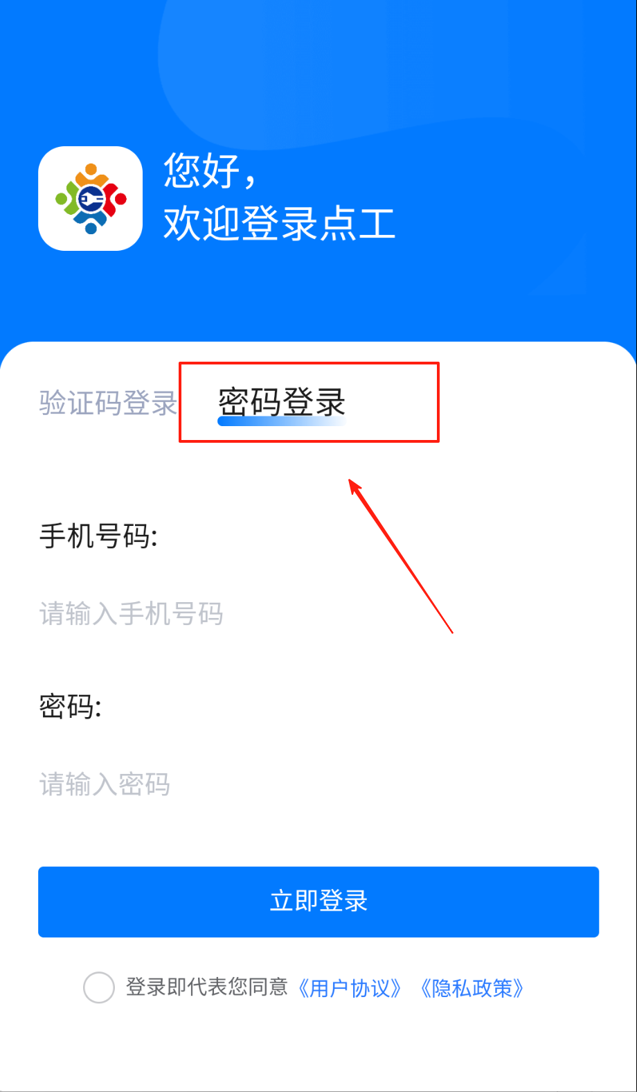 2、密码登录切换界面输入手机号和密码,关键操作是勾选协议同意框,确认协议点登录键才能成功进入软件哦。