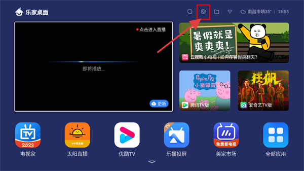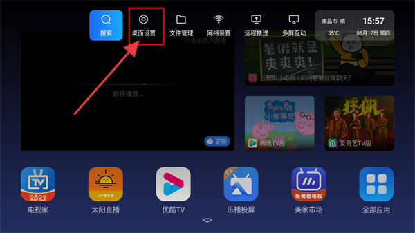 1、打开“乐家桌面”,首页有【搜索】【桌面设置】等功能,还有【电视家】【太阳直播】等应用图标,点击对应图标/功能使用。