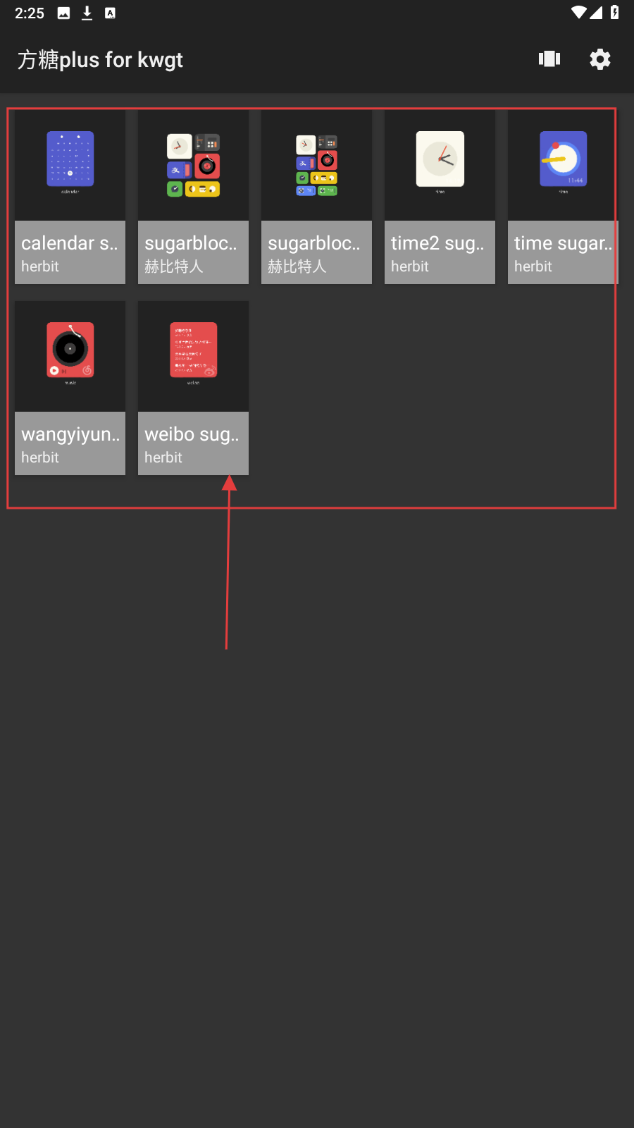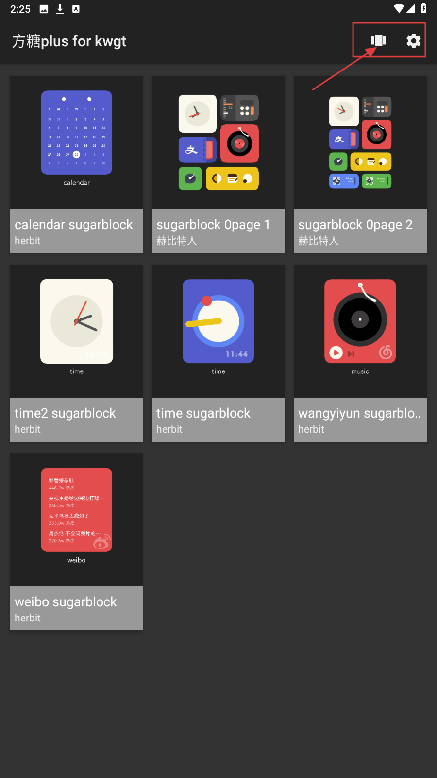1、打开“方糖plusforkwgt”应用,首页有【音量】【设置】图标,下方展示calendar、sugarblock等预设组件,点击可查看详情。