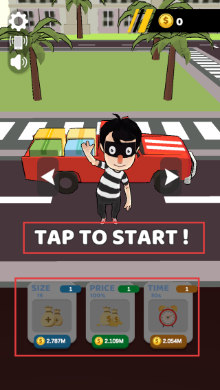 1、游戏开始,点击按钮进入游戏。可根据自身需求和资金情况,在起始界面选择提升“SIZE”“PRICE”“TIME”属性,增强游戏能力。