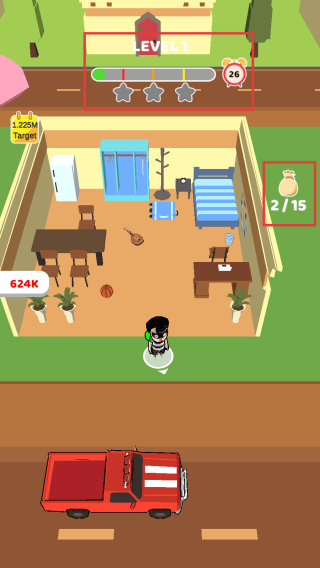 2、进入关卡后,注意屏幕上方的时间进度条和星级目标,在26秒倒计时内,操控角色收集房间内的钱袋,尽量快速且完整收集获取更高评价。