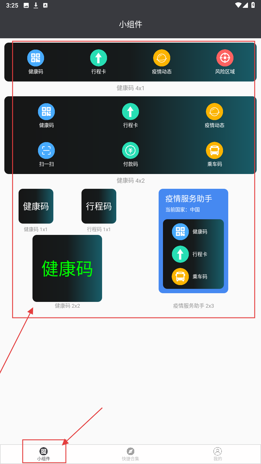 1、进入【小组件】页,有健康码、行程卡等组件(如健康码4x1、4x2等样式),选想要的健康码组件(如2x2样式)。