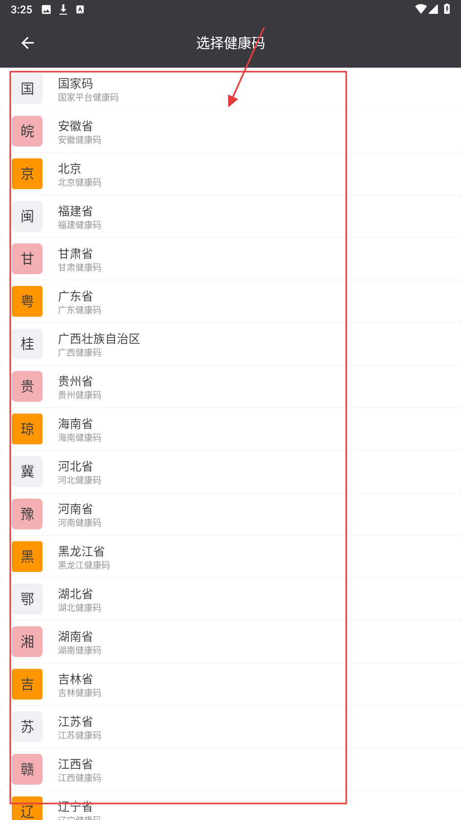 2、跳转【选择健康码】页,选对应地区(国家平台、安徽、北京等)健康码。