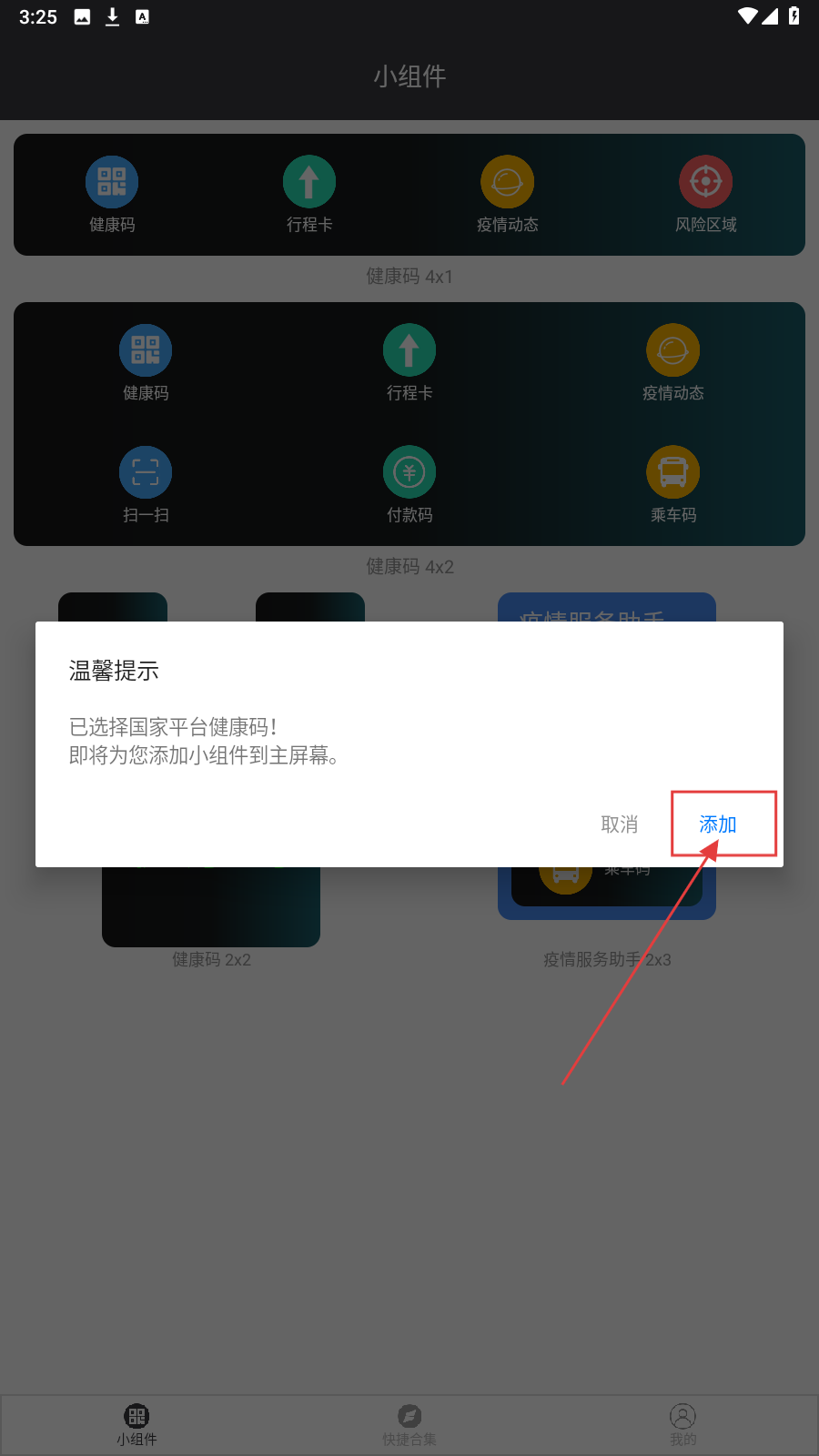 3、选好后弹出提示,点【添加】,将健康码小组件添加到主屏幕。