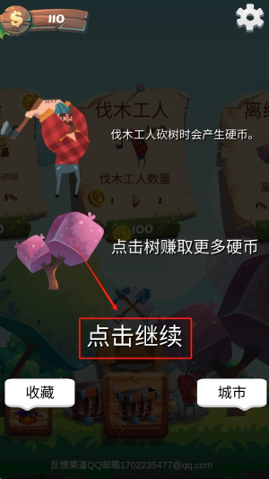 2、了解游戏机制:点击“点击继续”按钮,了解伐木工人砍树产生硬币的游戏机制。