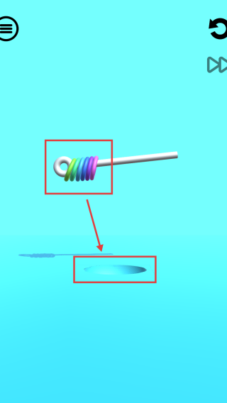 1、游戏开始,观察带有彩色圆环的杆子和下方孔洞位置,通过倾斜或滑动屏幕等操作,控制圆环下落方向,使其落入孔洞。