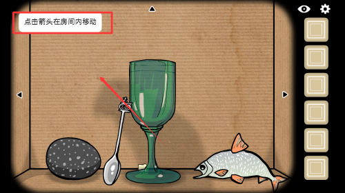 1、游戏开始,留意屏幕提示“点击箭头在房间内移动”,熟悉移动操作。观察场景中的物品,如石头、勺子、鱼等,初步了解可交互元素。