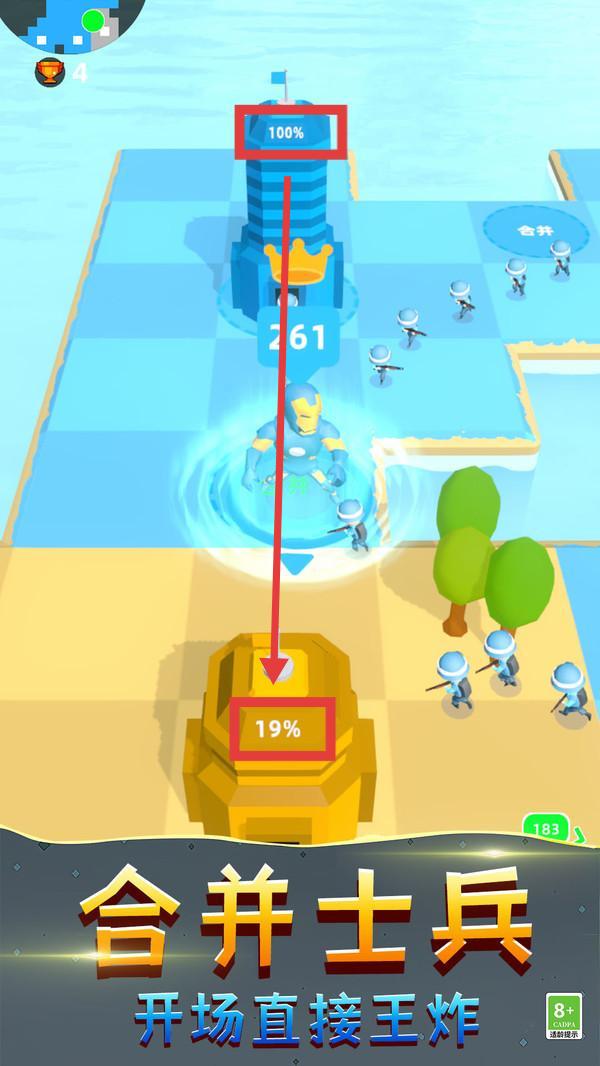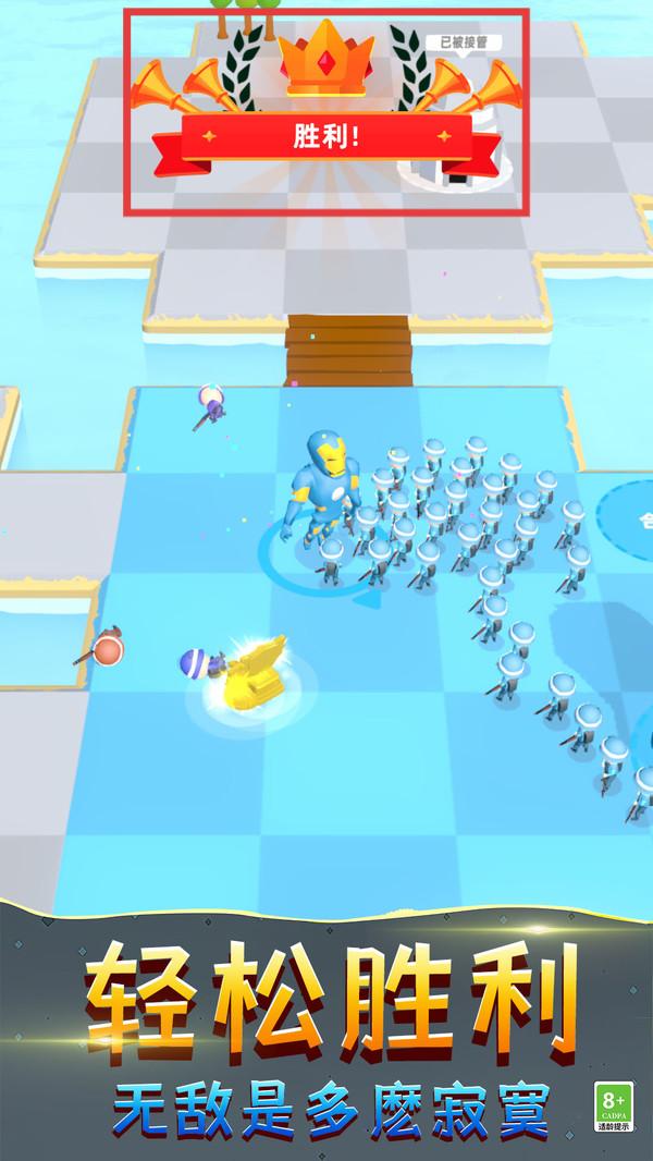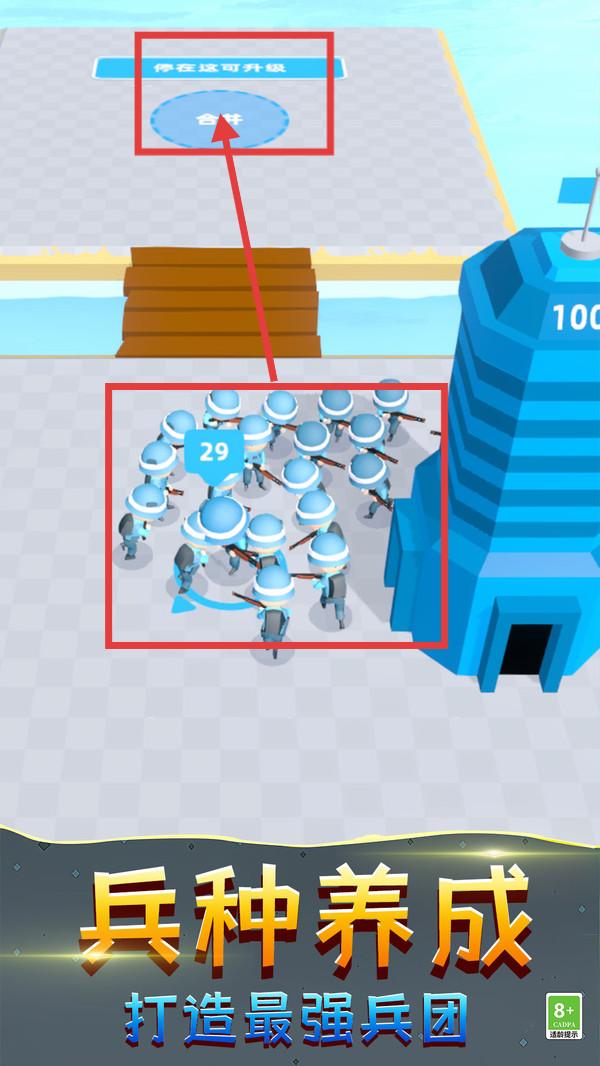 2、操控蓝色士兵移动,将士兵集中到指定区域合并,提升士兵等级和战斗力。