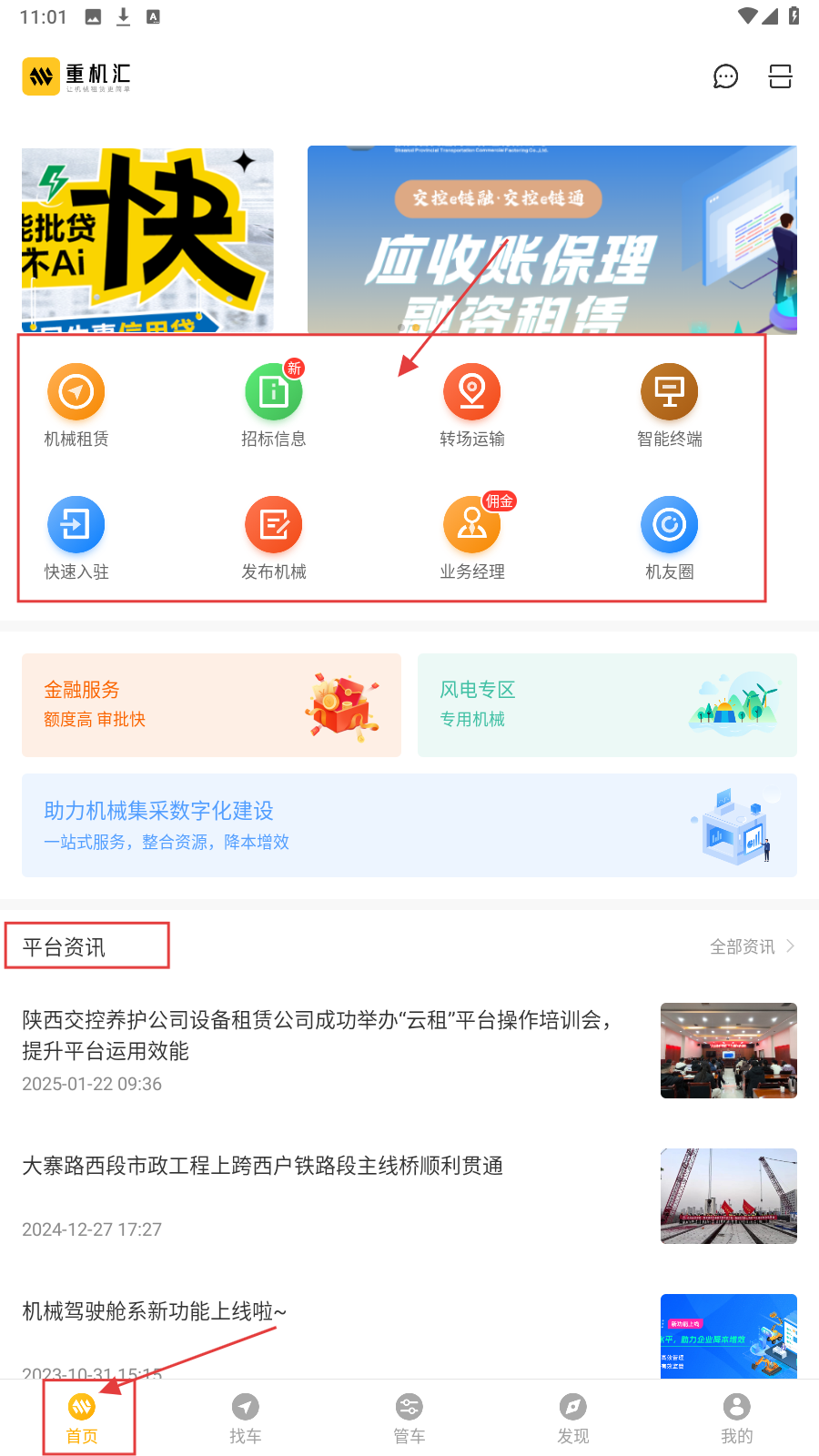 1、在【首页】,有“机械租赁”“招标信息”等功能、“金融服务”“风电专区”板块、“平台资讯”,点击对应功能/板块/资讯使用或查看。
