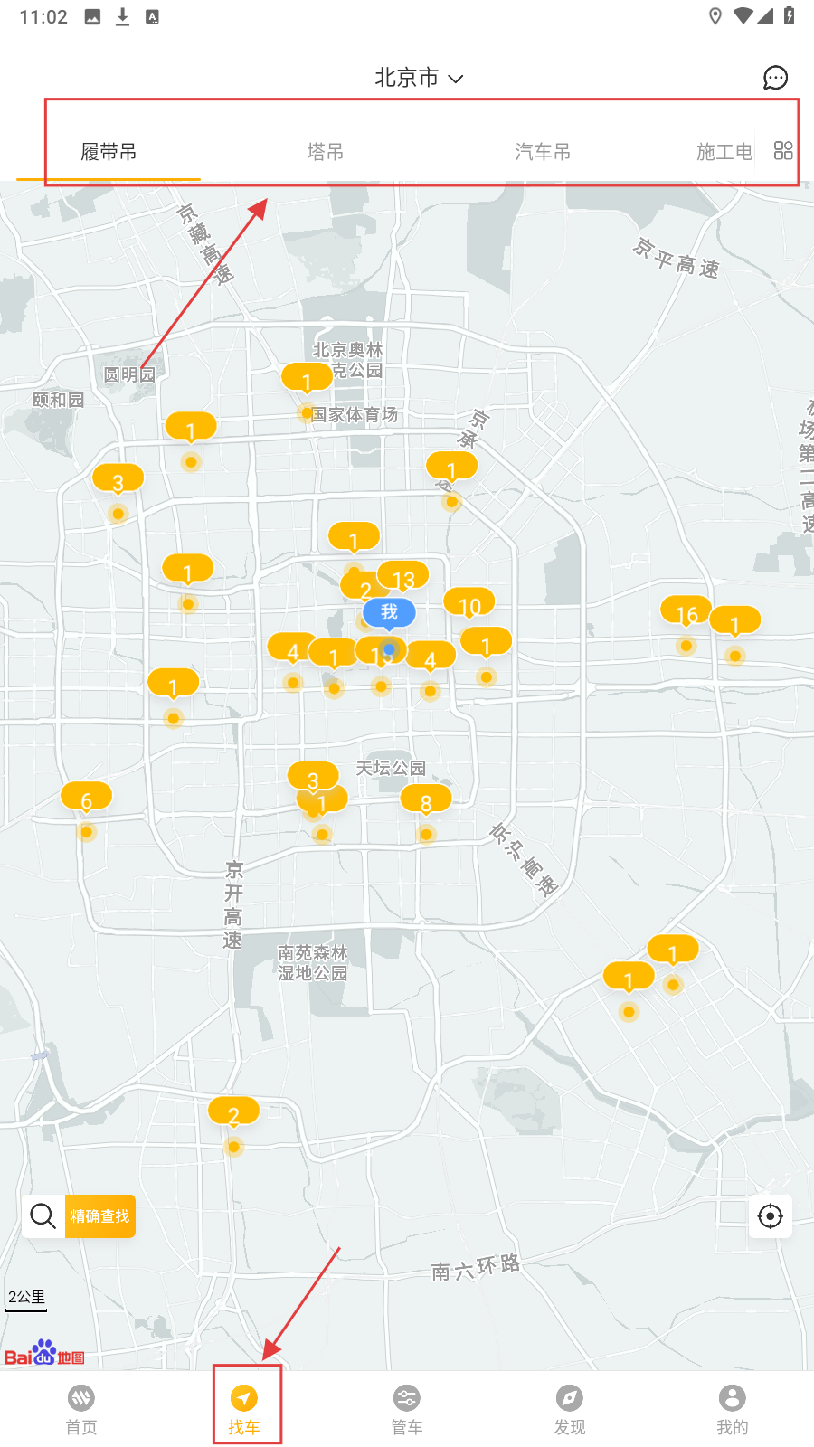 2、切换到【找车】页,定位“北京市”,有“履带吊”“塔吊”等设备分类,地图上有设备分布点,点击分类/点位找设备,点“精确查找”精准搜索。