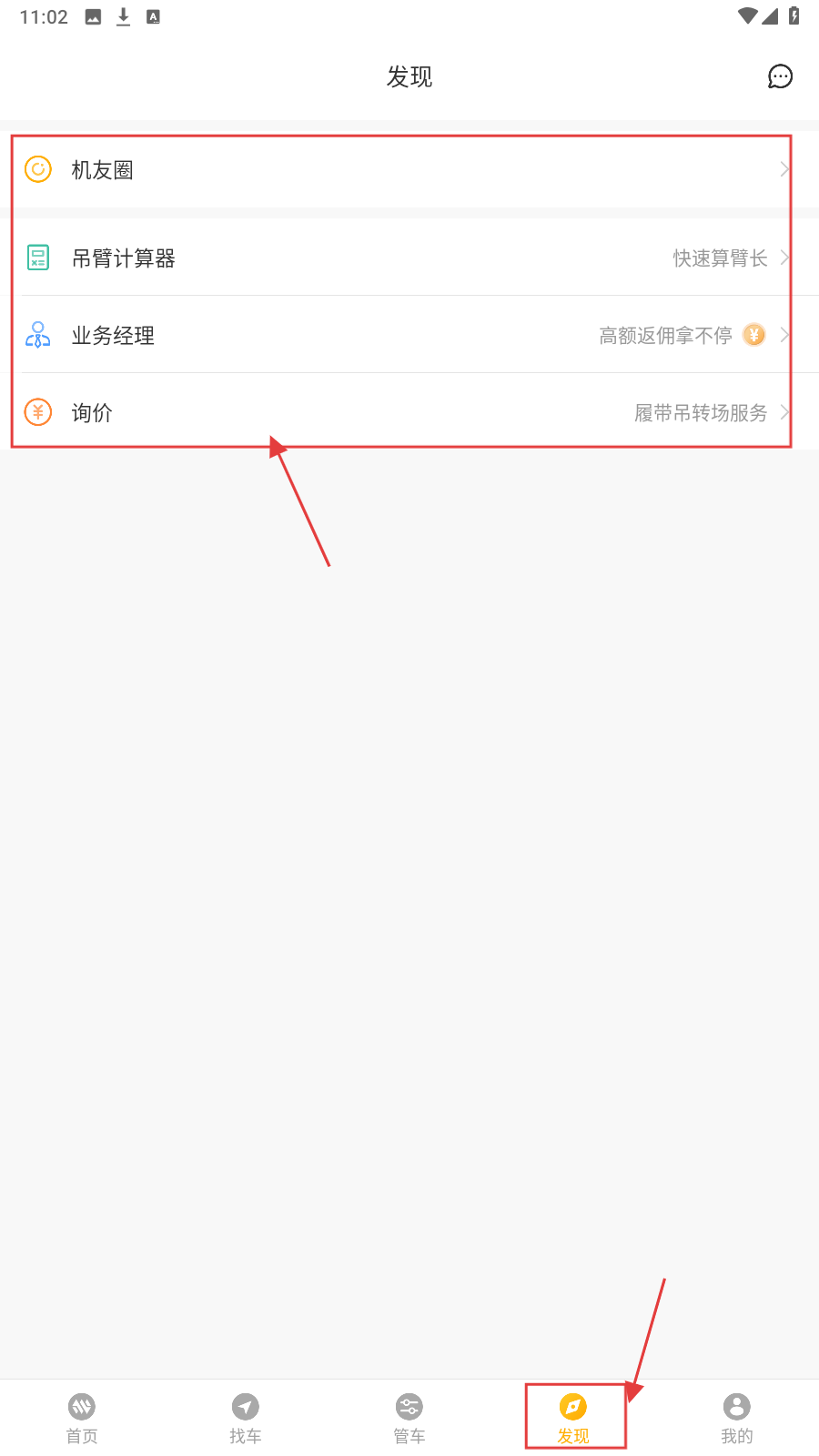 3、进入【发现】页,有“机友圈”“吊臂计算器”等4个功能,点击对应入口使用(如用吊臂计算器算臂长)。