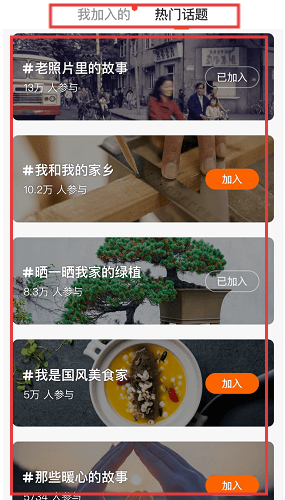 1、在话题界面,存在【我加入的】与【热门话题】分类。点击对应话题,能进行加入或者查看已加入话题的操作。