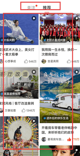 2、切换至内容展示界面,分为【关注】和【推荐】标签。点击相关内容,可浏览视频以及互动数据。