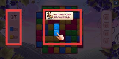 1、游戏开始,留意屏幕左侧的关卡数,明确当前挑战关卡。观察游戏界面中的彩色方块,根据操作提示,点击相同颜色方块进行消除。