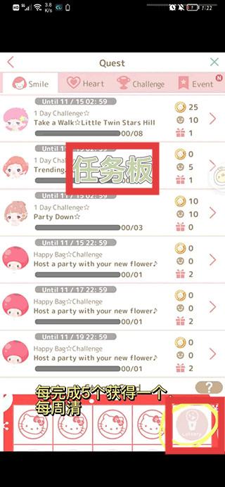 3、进入“任务板”查看任务,按提示完成任务,获取金币和其他奖励。每完成5个任务有额外奖励,且每周清零。