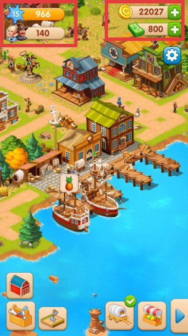 1、游戏开始,关注屏幕上方等级、金币、钞票等资源数值。通过完成任务、种植作物、经营建筑等方式获取资源,提升等级。