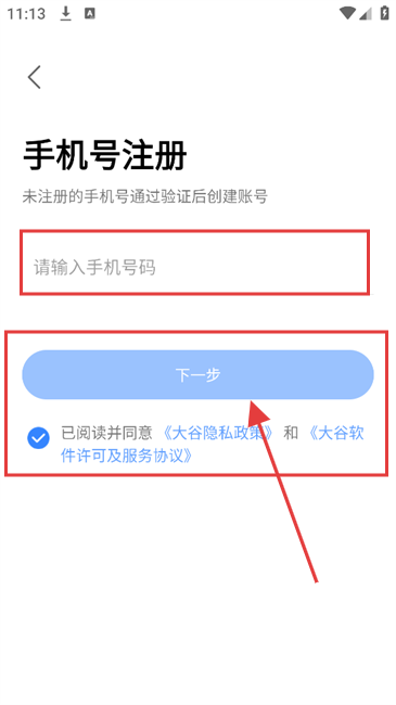 2、到【手机号注册】页,输入手机号,勾选协议,点【下一步】。