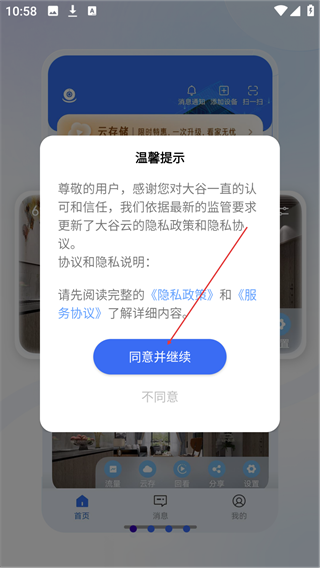 1、在应用启动后的温馨提示弹窗中,点击【同意并继续】按钮,进入应用首页。