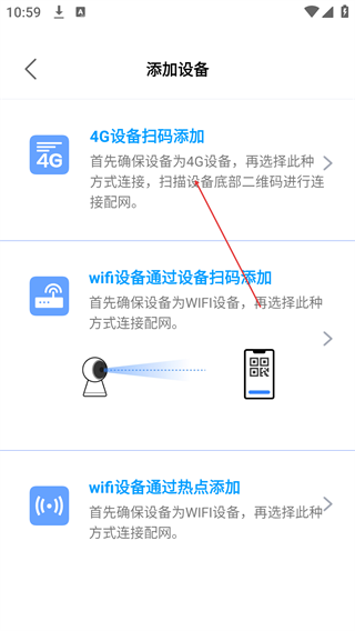 3、在添加设备方式选择页面,选择【4G设备扫码添加】选项,进入设备绑定页面。