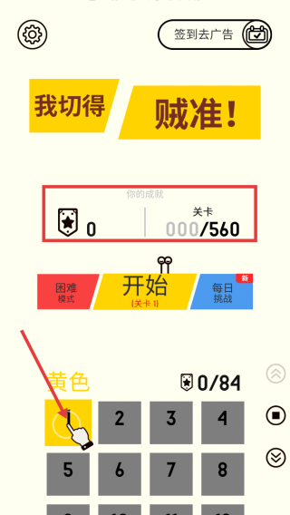1、游戏开始,在主界面可看到成就值和关卡进度(0/560)。可选择“开始(关卡1)”进入普通关卡,也可尝试“困难模式”或“每日挑战”。