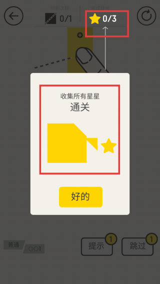2、进入关卡后,留意屏幕上方的切割次数限制和星星收集目标(如0/3)。根据提示“收集所有星星通关”,合理规划切割路径。