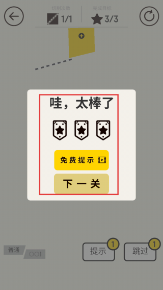 3、成功收集所有星星完成关卡后,会收到“哇,太棒了”提示。可选择“免费提示”获取后续关卡帮助,或点击“下一关”继续挑战。