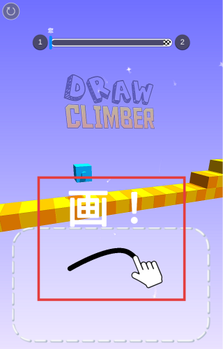 1、游戏开始,看到“画!”的提示,在指定区域内用手指绘制线条,为蓝色方块角色创造行进路径。线条的形状和位置会影响角色移动。
