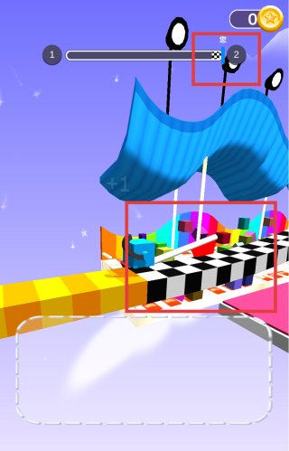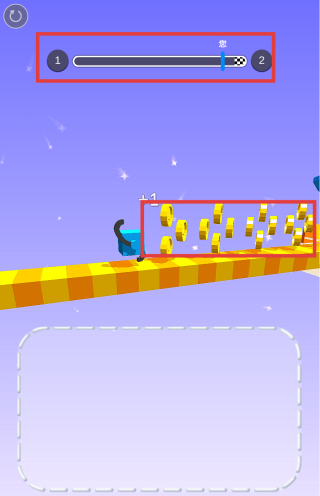 2、绘制好线条后,角色开始移动,注意观察进度条,了解当前关卡进度。操控角色收集路径上的金币,增加得分。