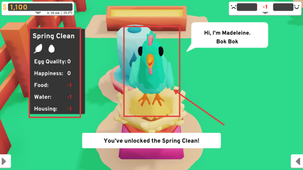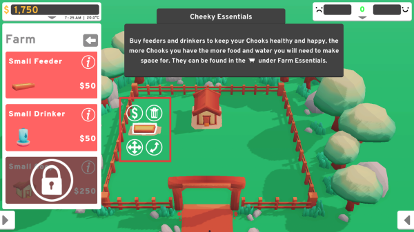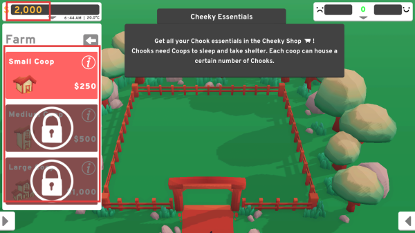 1、游戏开始,拥有2000游戏货币。优先购买“SmallCoop”(250货币)为小鸡提供住所,满足其基本生活需求。