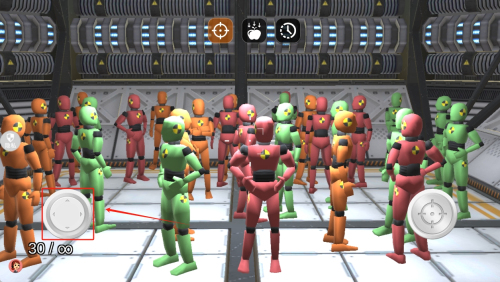 2、如何射击机器人?在教程中,使用屏幕上的虚拟摇杆和射击按钮,瞄准并射击前方的机器人。