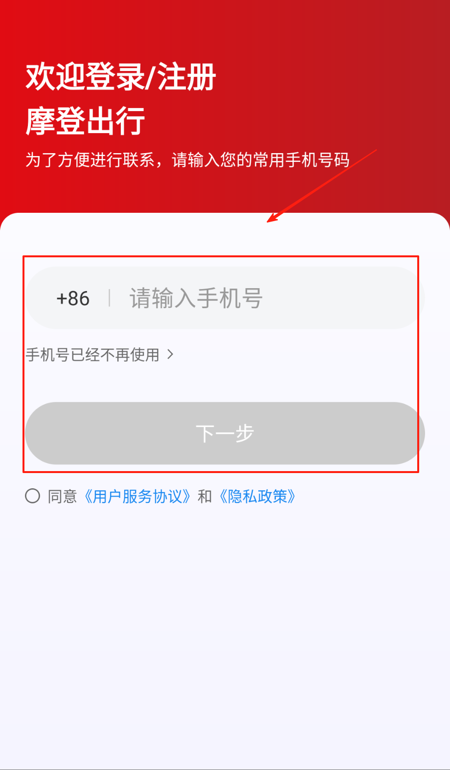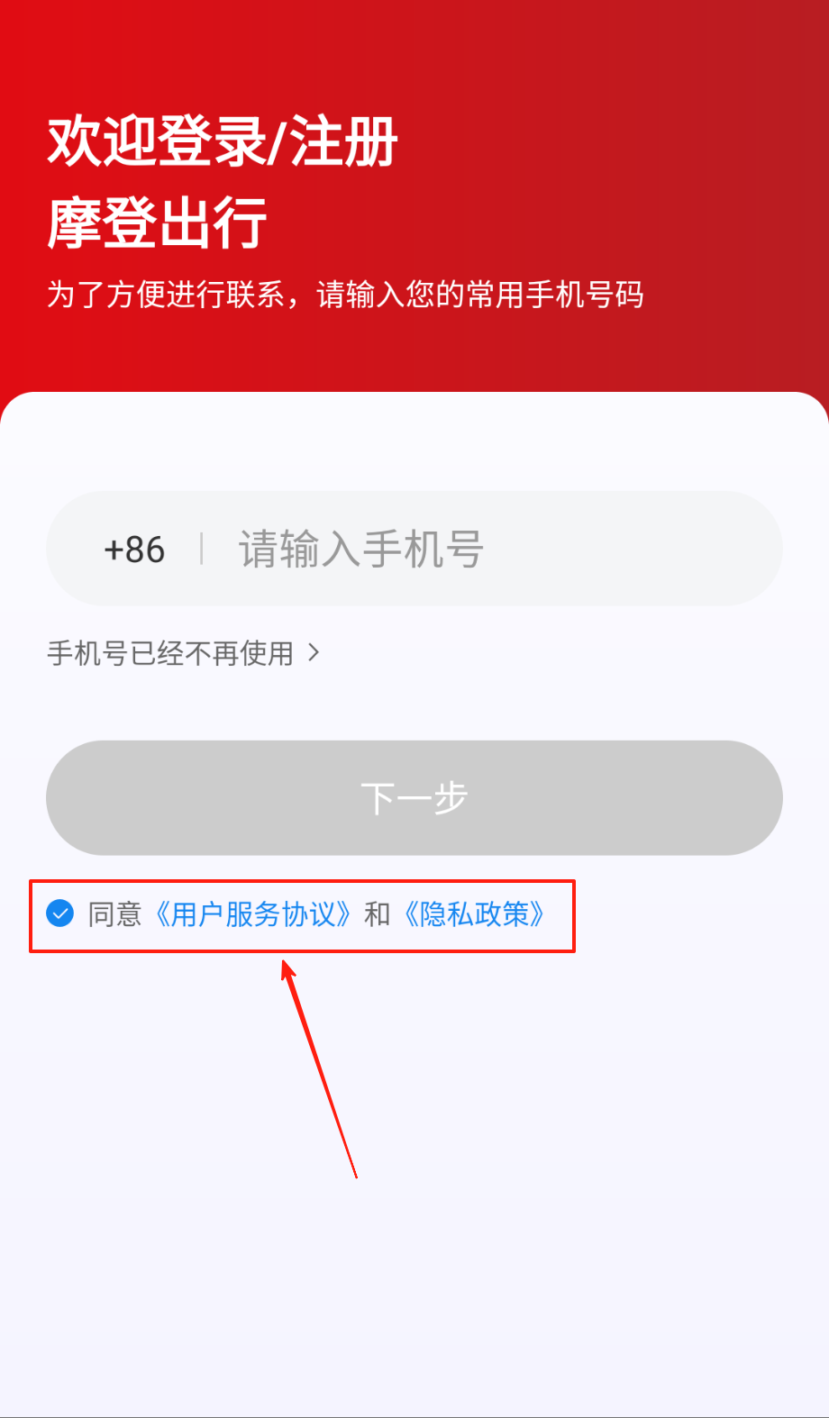 2、新注册先打开红色界面输手机号,注意+86后面填数字别漏号,勾选两个协议框才能点下一步啦。
