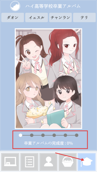1、游戏开始可关注毕业纪念册(卒業アルバム)的完成度,通过完成游戏任务逐步提升完成度,解锁相关内容。