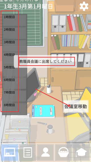 2、在日程安排界面,留意时间节点(如1年生3月第1月曜日)和任务提示,按时点击“会議室移動”完成任务,推动游戏进程。
