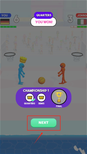 3、赢得比赛:成功得分并赢得比赛后,点击“NEXT”按钮进入下一轮比赛。