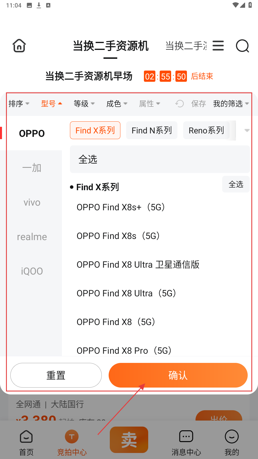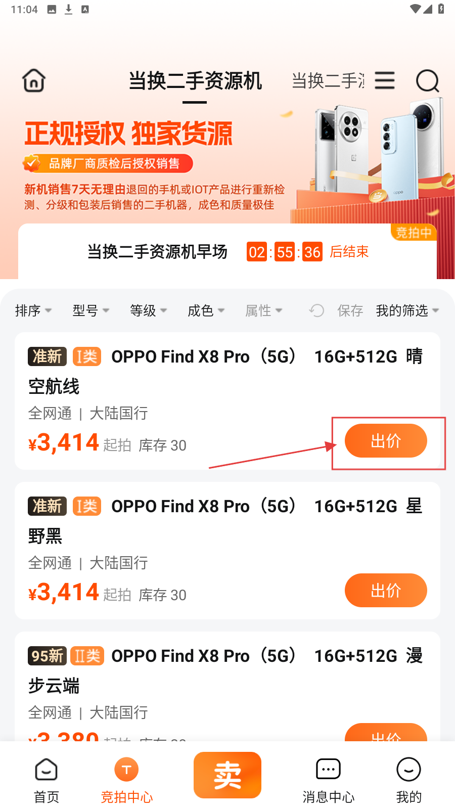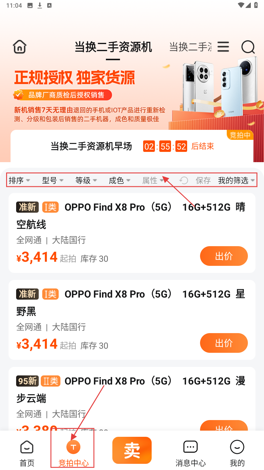 1、在APP【竞拍中心】,可通过【排序】【型号】等筛选项,筛选二手资源机。