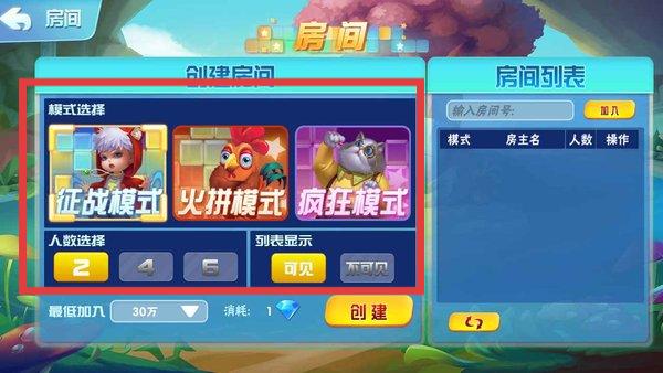 1、可根据喜好在【征战模式】【火拼模式】【疯狂模式】中选择游戏模式,设置列表显示状态,满足最低加入条件后,消耗1钻石创建房间。