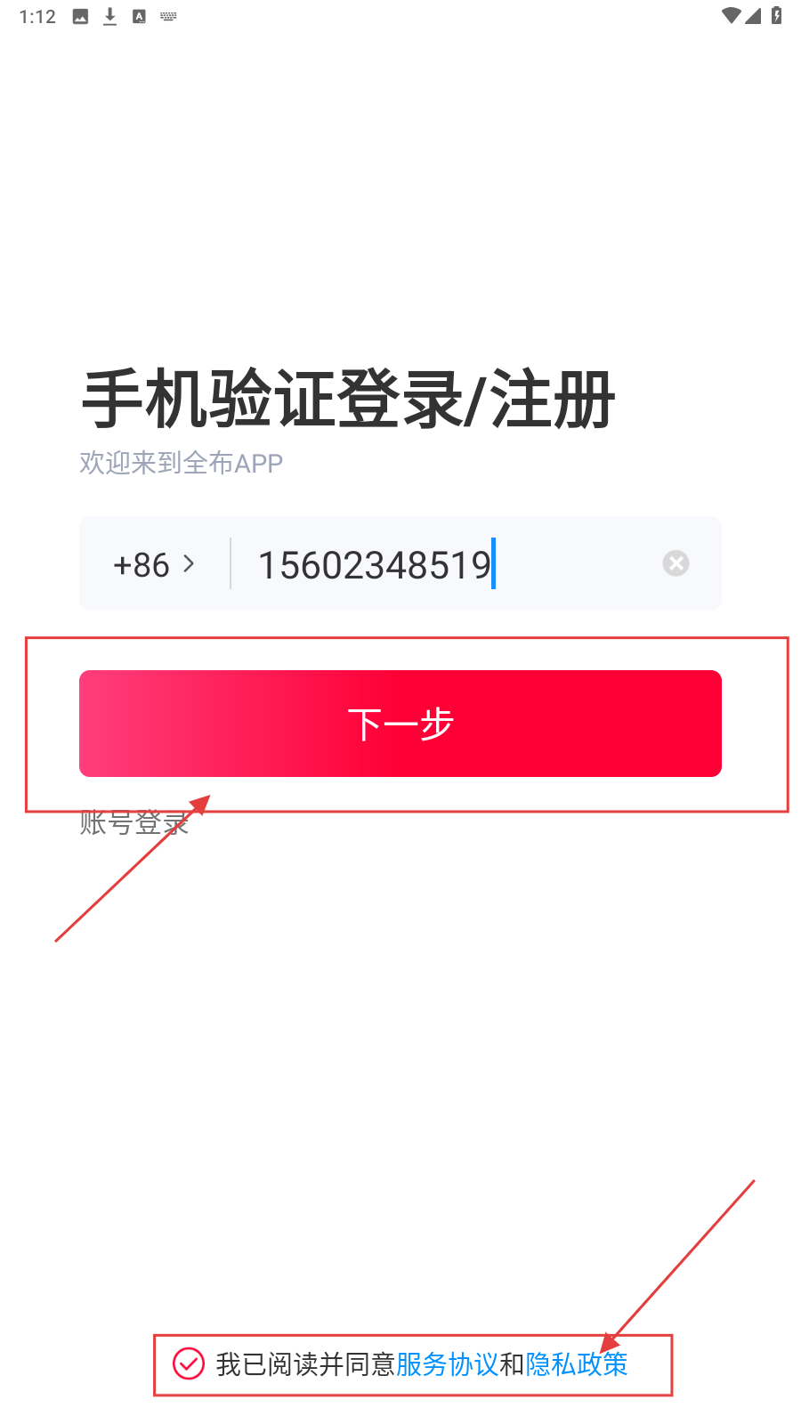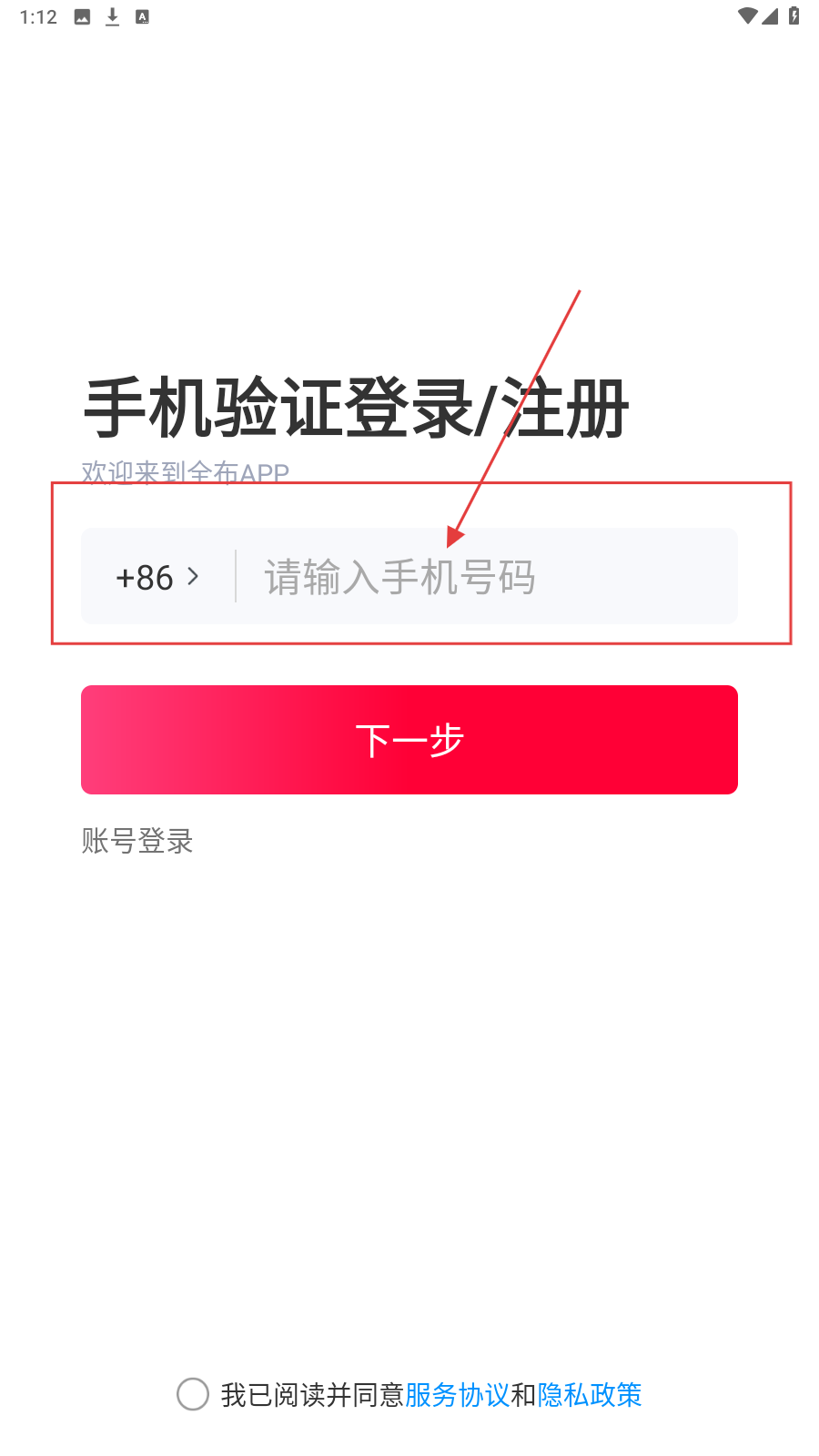 1、打开全布APP,进入手机验证登录/注册页,在“请输入手机号码”框填入号码。