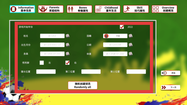 1、在球员创建界面,根据需求设定【游戏开始年份】等【基本信息】,惯用脚选【右】,还可点击【随机创建球员】快速生成角色。