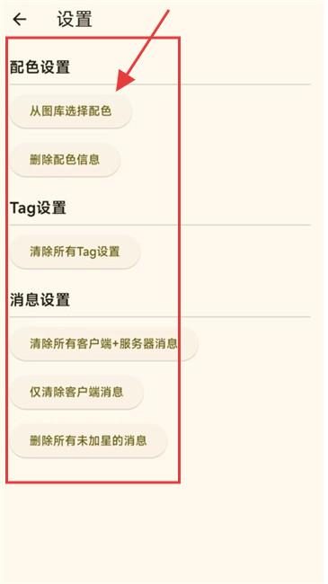 3、进入【设置】页,可操作配色(从图库选、删除)、Tag(清除所有设置)、消息(清除/删除各类消息)相关功能。