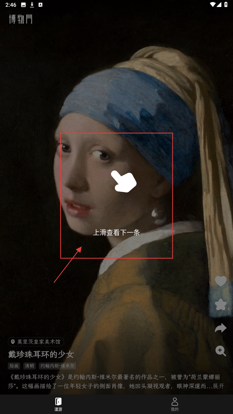 1、进入“博物门”APP【漫游】页,展示画作《戴珍珠耳环的少女》,上滑查看下一条内容(如《风檐展卷》)。