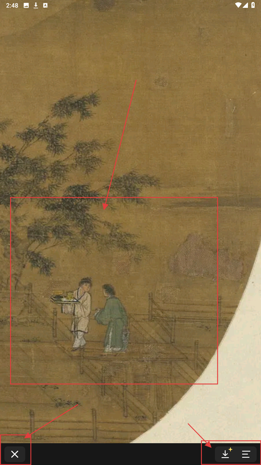 3、点击右下角放大镜,可放大查看细节,底部有关闭(×)、下载/更多按钮,按需操作,完成画作浏览与交互流程。