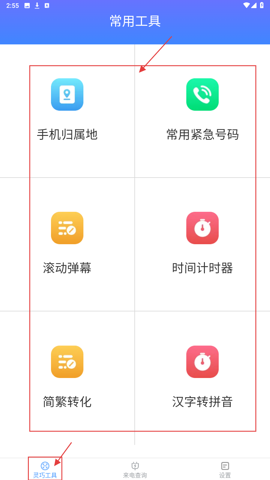 1、进入“常用工具”APP的【灵巧工具】页面,可见【手机归属地】【常用紧急号码】等工具。