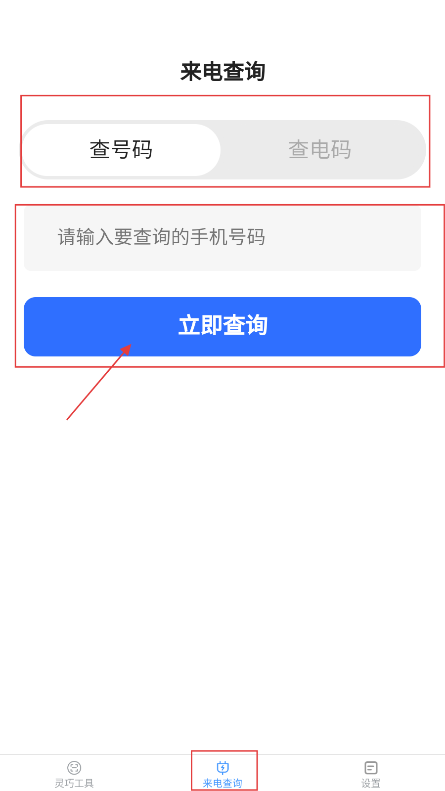 3、切换至【来电查询】页,选【查号码】,于【请输入要查询的手机号码】填号,点【立即查询】,获取来电详情,完成号码查询流程。