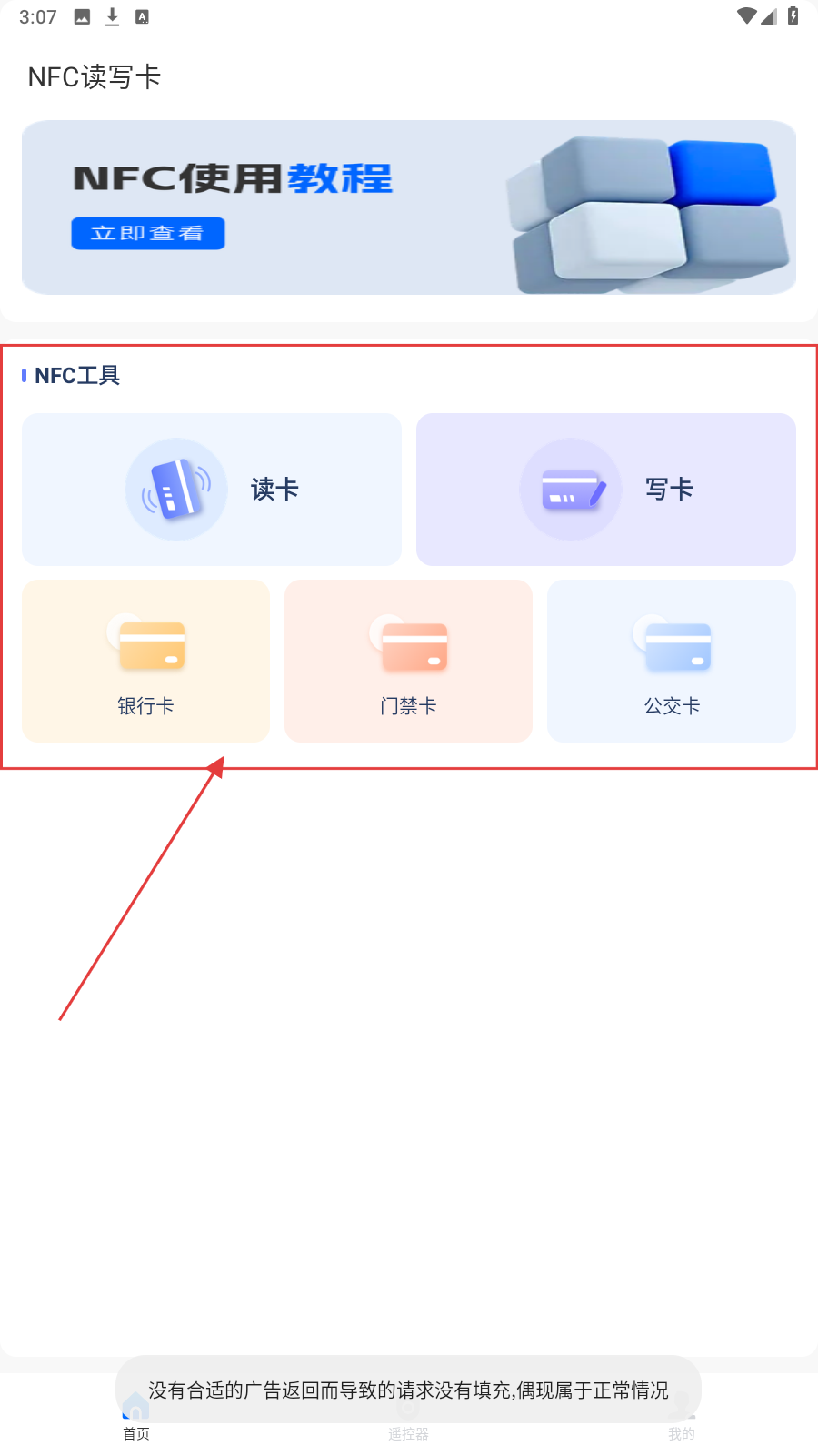 1、进入APP,在【NFC工具】区,选【银行卡】功能。