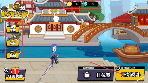 1、游戏开始前,可通过点击【英雄】【装备】等提升角色、装备和武器能力,利用【点石成金】消耗闪电获取金币,点击【开始战斗】。