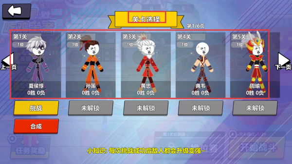 2、关卡选择界面,优先挑战低等级关卡如【第1关】积累经验和资源,每次挑战成功后敌人会变强,注意及时提升自身实力。