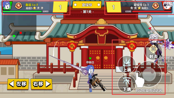 3、战斗中,通过【左移】【右移】控制角色走位,利用【上跳】【下跳】躲避敌人攻击,按【射击】键远程攻击敌人。